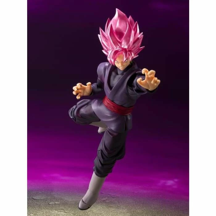 Goku Black in Super Saiyan Rose form returns to the S.H.Figuarts line in a special colorway, featuring a shiny pink metallic finish on his hair.