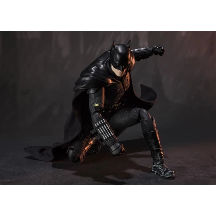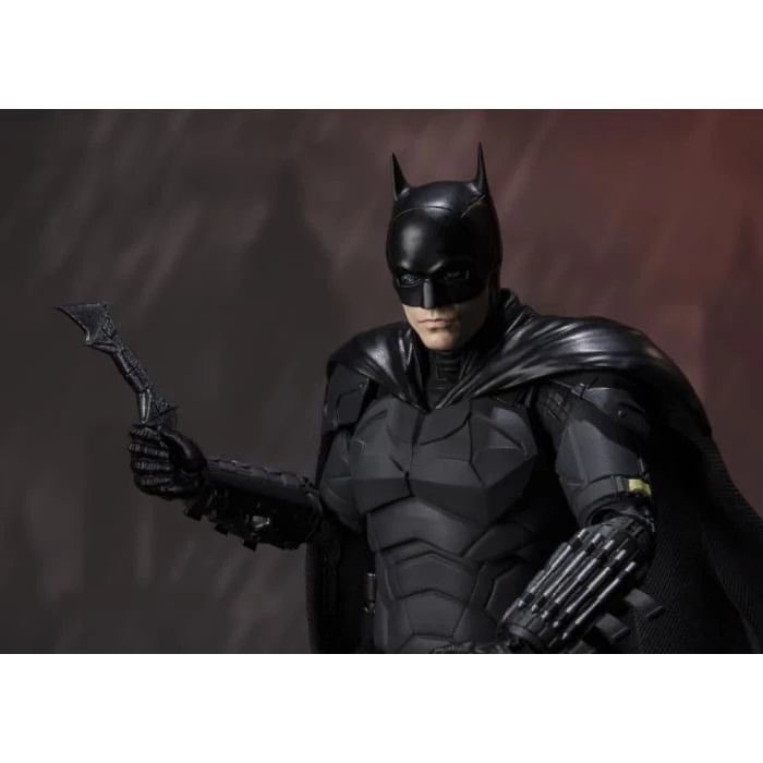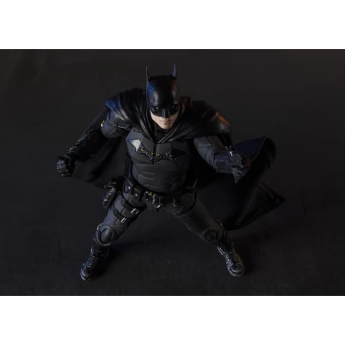 From the new film βThe Batmanβ Batman joins the S.H.Figuarts lineup. Standing approximately 6 inches tall, this 1/12 scale figure includes a cloth cape with integrated posing wire, and an unmasked face portrait of Bruce Wayne featuring the black paint around his eyes as seen in the film. Both faces use Tamashii Nationsβ Digital Printing technology to capture the actorβs likeness in fine detail. Other included accessories are the Bat Knife that forms from his chest emblem, handcuffs, grapnel launchers, and the adrenaline pen.