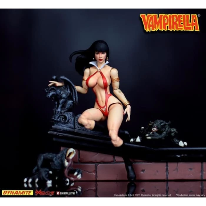 Vampirella is now a 1/12 scale action figure! When a spaceship from Earth crash lands on the dying planet Drakulon, the remaining dying inhabitants, the Vampiri, send Vampirella to investigate to find the pilots from Earth that have blood flowing through their veins; blood which at one point in time flowed in rivers through Drakulon but now has stopped flowing, causing the inhabitants to die off. Vampirella is able to pilot the spaceship back to Earth where she becomes a “good” vampire and devotes her energy to ridding our world of the evil vampires.