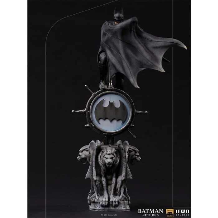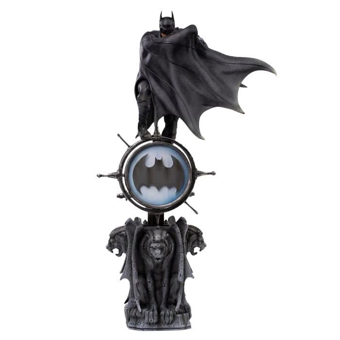 A concrete totem-shaped base, surrounded by gargoyles shaped like Chimeras, serves as a platform for one of Gotham’s most striking symbols, the Bat-signal, which is a powerful spotlight used by law enforcement officers led by the admirable Commissioner Jim Gordon. The Bat sign is used to summon Gotham City’s most dedicated defender. With his symbol reflected in the skies, the Dark Knight answers the call and scales the artifact, hidden by the shadows of his dense black cape that surrounds his body, like the great wings of a bat, symbol of his identity and cause.