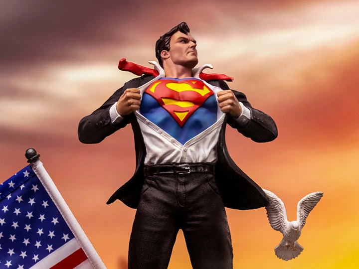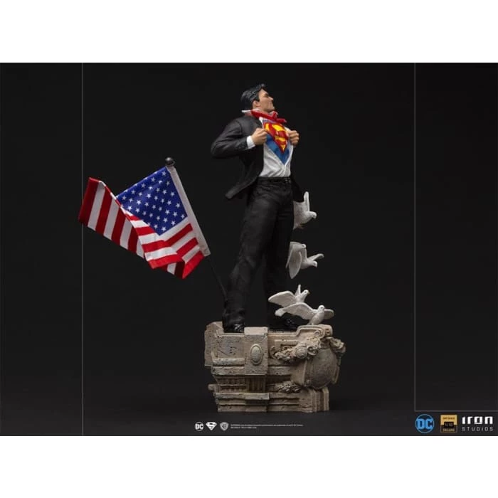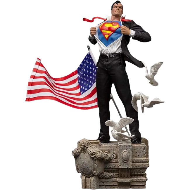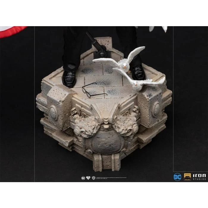 On top of a building in the big city of Metrรณpolis, Clark Kent, the shy reporter for the Daily Planet tabloid, glimpses the sky with a serious and thoughtful face. Focused on a distant target, he opens his shirt revealing his unmistakable red and yellow coat of arms in the shape of an โSโ on his so popular blue suit. Ready to take flight, with some pigeons, a subliminal symbol of peace, and next to the flag of the USA, the nation where he was raised and which became his home, this superman,ย the hero of heroes, is presented by Iron Studios in a no less important version, him as a civilian.