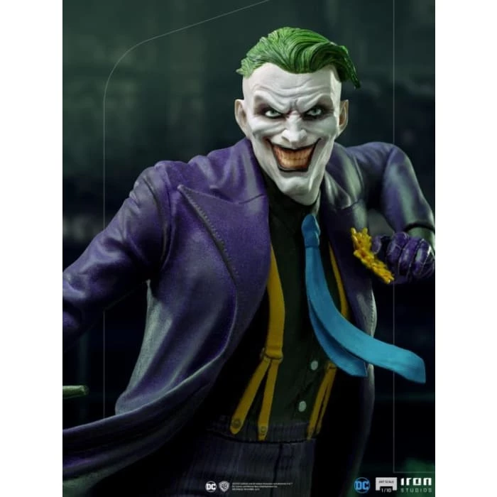 “With a more contemporary look, but not leaving his past behind, combining classic colors and elements, dressed in purple, complemented with an black shirt, orange suspenders, and a blue tie, The Joker gets one more version derived from the DC Comics by Iron Studios.”