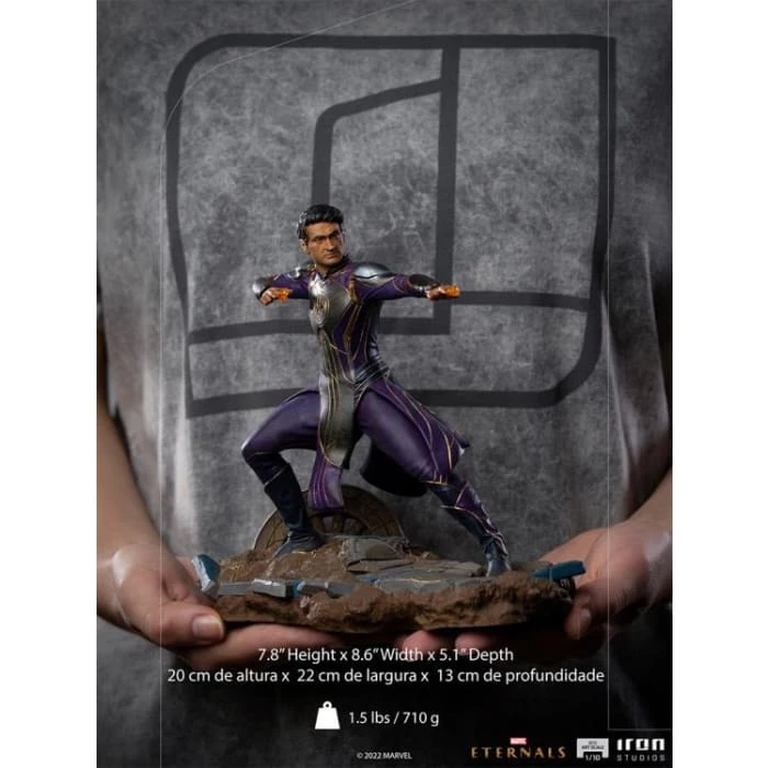 Confident and always prepared for action, he points his fingers ready to shoot spheres of cosmic energy. An extremely skillful combatant with millions of years of training and experience, he fell in love with the spotlights of fame, richness, and comfort, establishing himself in India, he becomes a famous star in the cinematic industry of Bollywood. To hide his immortality, he faked being the descendant of a single lineage of actors. With his purple celestial armor, Iron Studios bring the Kingo statue, with the actor, dancer, director, and superhero member of the Eternals in the fight against the Deviants.