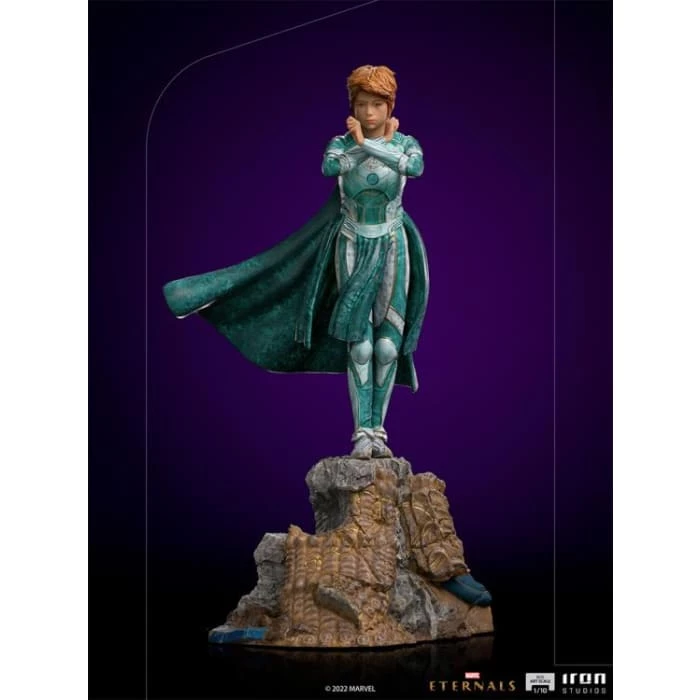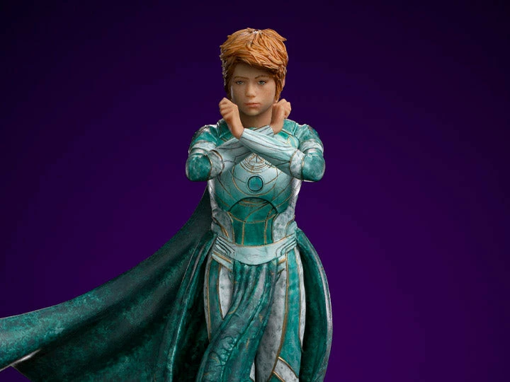 With her arms crossed in front of her small body, the fiery, playful, and sarcastic illusionist of the immortal Eternals, prepares to use her cosmic energy and abilities to create identical duplicates of herself, to change her appearance, or to create impressive and realistic illusions with sound effects. With the permanent aspect of an infantile teenager, she told stories for humanity throughout the centuries, creating many myths and legends throughout history. Wearing her turquoise celestial armor, Iron Studios bring the Sprite statue, with the small hero of red hair and acid humor of the Eternals.