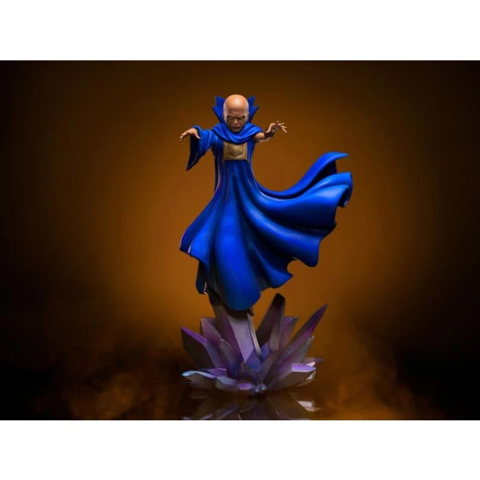 Levitating over the purple crystals of the so-called Mirror Dimension, a cosmic being with immeasurable power, aware of everything that happens in the existing universes within the multiverse and of its most emblematic inhabitants, raises his big arms using his power to circumvent the barriers between realities. Capable of identifying any diverging point in the reality thanks to his advanced intellect and omniscience, with his almost divine powers this giant established himself in the Nexus of All Realities just to watch and register the most memorable moments of each universe. With humanoid features and white eyes without pupils, he wears a big blue cloak as a uniform that indicates his status. Iron Studios proudly bring the statue of The Watcher, the narrator and guide character throughout different realities in Marvelโs multiverse in the animated series What If…?.
