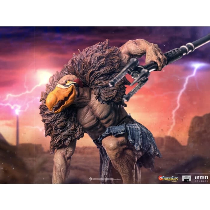 Like the bird of prey, it bears a resemblance to and is named after, the anthropomorphic creature with a long beak and a back covered in long brown fur rather than feathers, perches high on a rocky base on the planet known as Third Earth, watching with hisshrewd eyes and wielding his staff, or spear, with the tip in the form of claws. Another native derived from the different races of beastly beings, from the planet Plun-Darr, the Iron Studios Vultureman BDS statue features the cunning and underhanded scientist and inventor member of the ThunderCats’ enemies known as the Mutants.