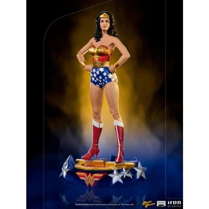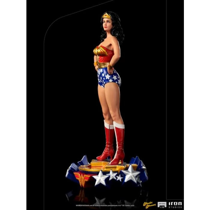 In her imposing and heroic pose with the clenched fists standing on her waist, wearing her costume created by Queen Hippolyta, with Americaโs emblems (land to which she went to defend the world), her golden belt, source of her power and strength while sheโs away from Paradise Island, and equipped with her deflecting bracelets and her Lasso of Hestia, Iron Studios proudly present their statue of Wonder Woman, with the unforgettable and beloved hero in her artistic version from TV, on a pedestal decorated with a logo and stars that refer to the opening animation for the series.