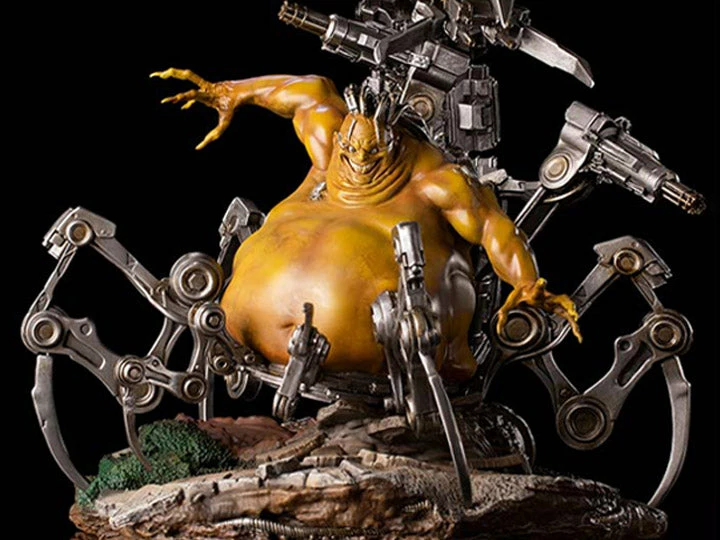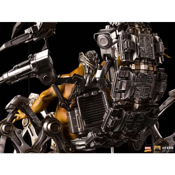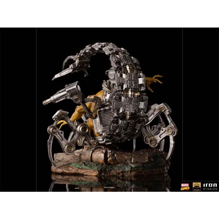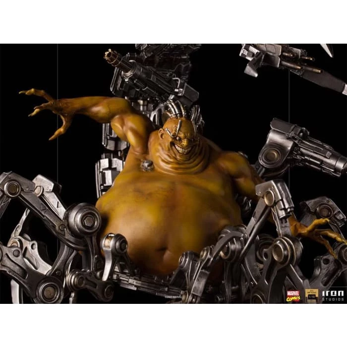 As if he’s come straight out of a nightmare, a burly, misshapen, yellow-skinned being moves like an arachnid. Moved by mechanical paws that come out of a motorized platform to transport his obese body. He is supported by a metallic tail, in place of his spine, that just like a scorpion, releases deadly resources, and also has claws and particle beam weapons. A fearsome interdimensional sorcerer, master of manipulation and machinist of his universe, he advances, atop a base that resembles the gardens of Mansion X, along with other mutant super-villains, in a diorama setting, alongside Magneto and Robots Sentinels versus the X-Men.
