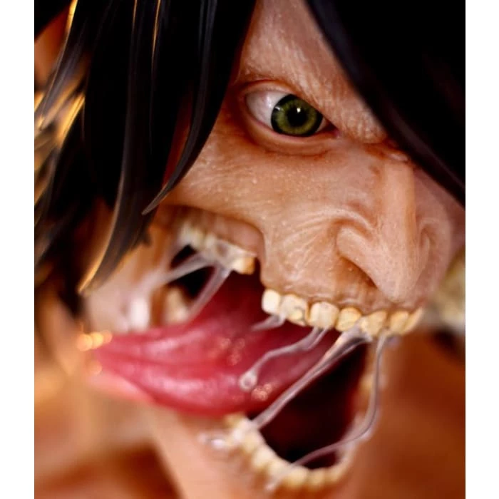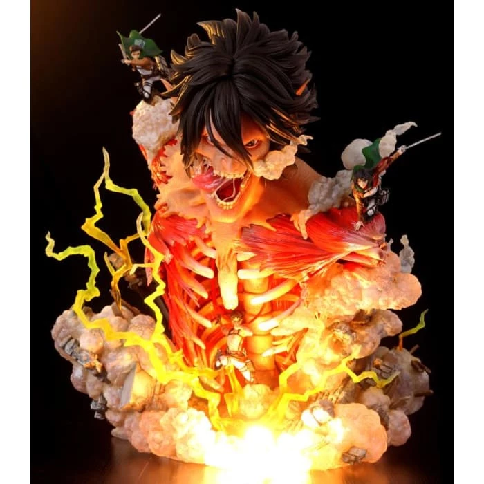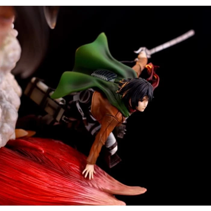 The Hope for Humanity diorama depictsย Eren swinging forward and mid transformation as he bites his hand to initiate the gruesome process along with Mikasa and Levi on the Titan’s shoulders.