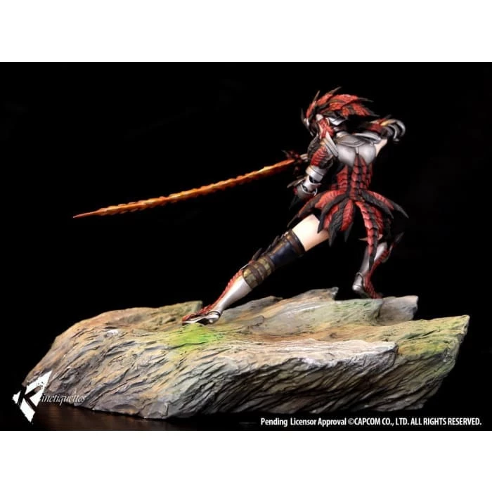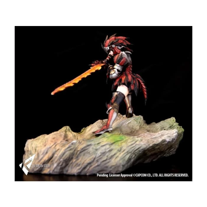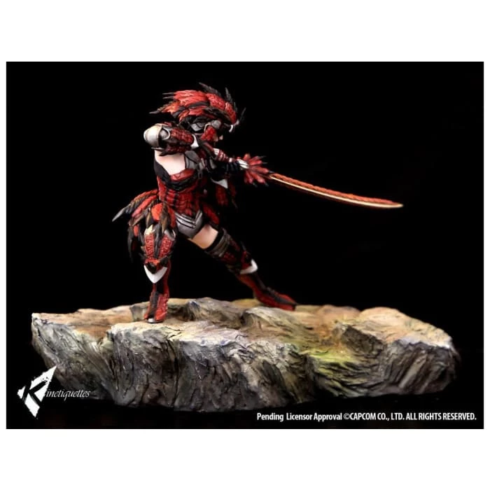 A HUNTER is a person that makes a living by hunting monsters and doing requests for civilians. They have a wide amount of knowledge and a higher exercise capacity compared to normal people, so this is a field of work that not too many can take part in. This statue depicts a female hunter attired with full Rathalos armor in a dynamic charge attack pose about to strike with the Long Sword.