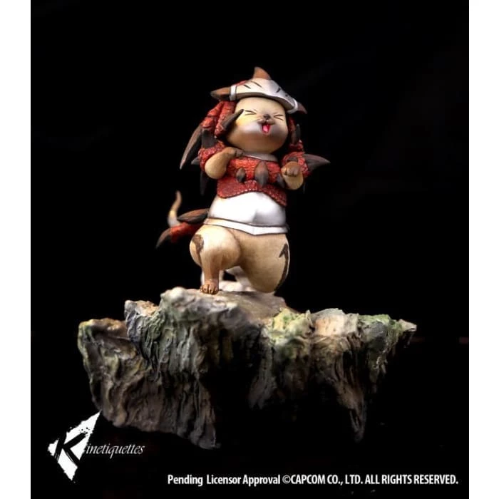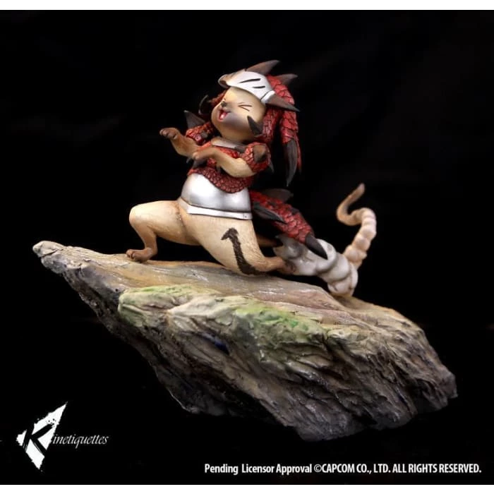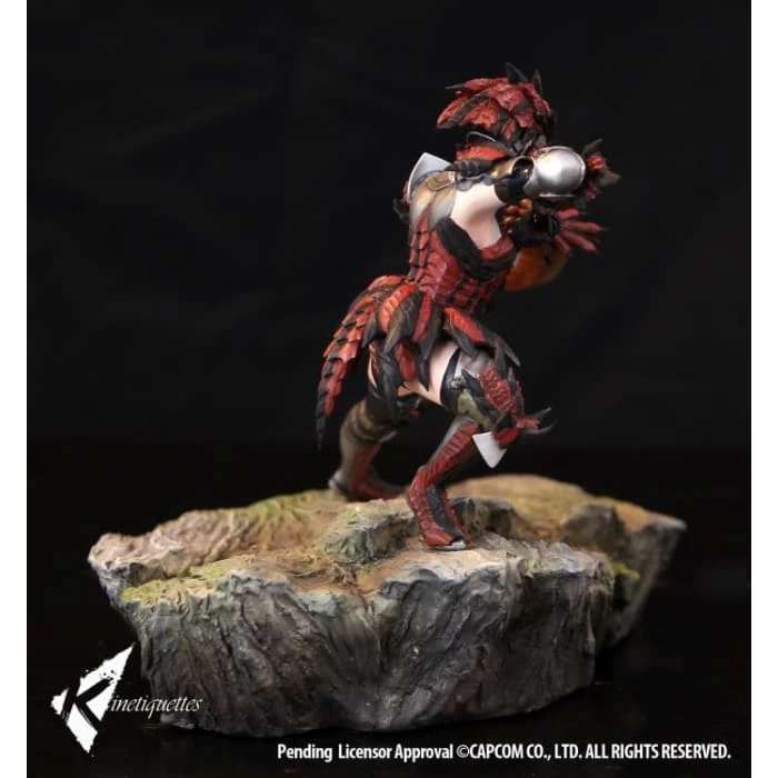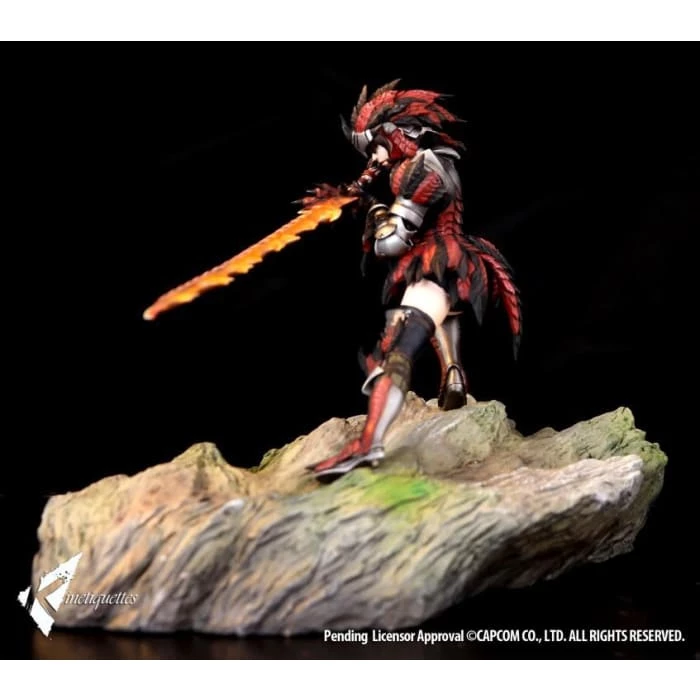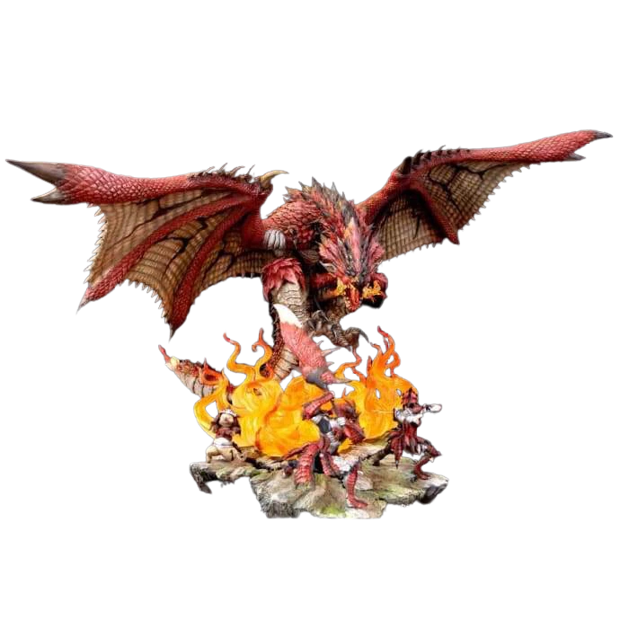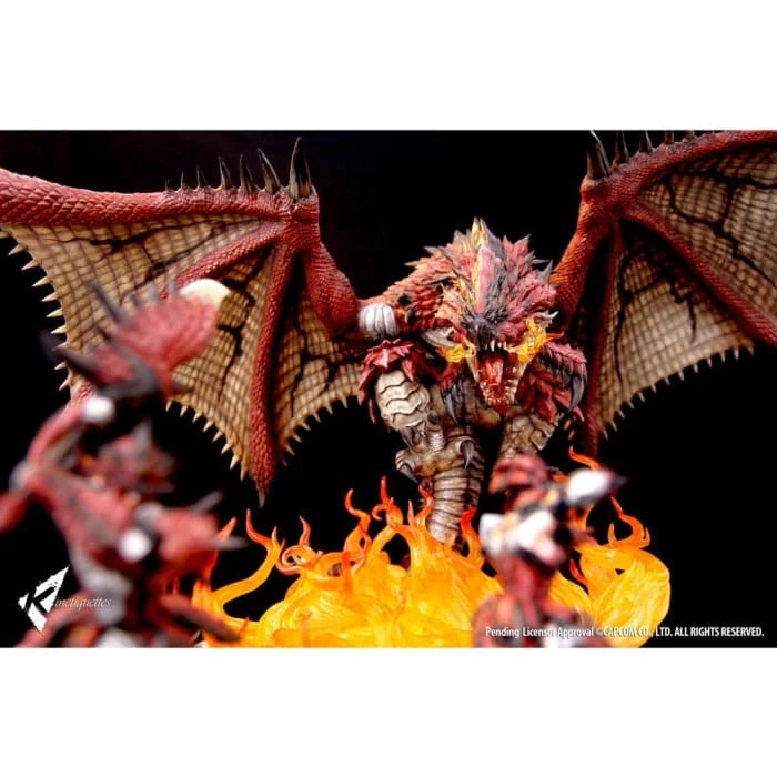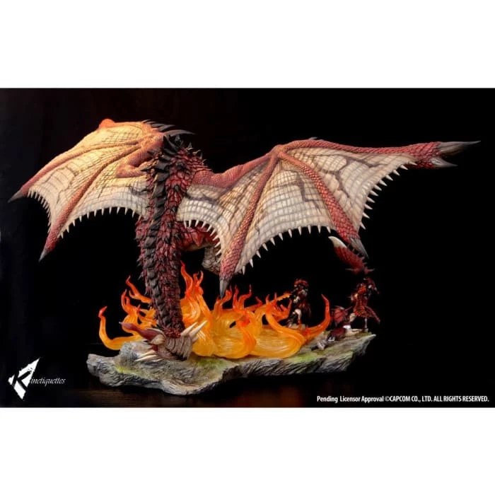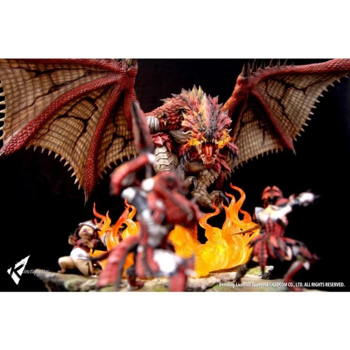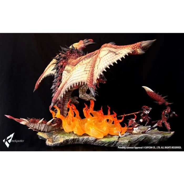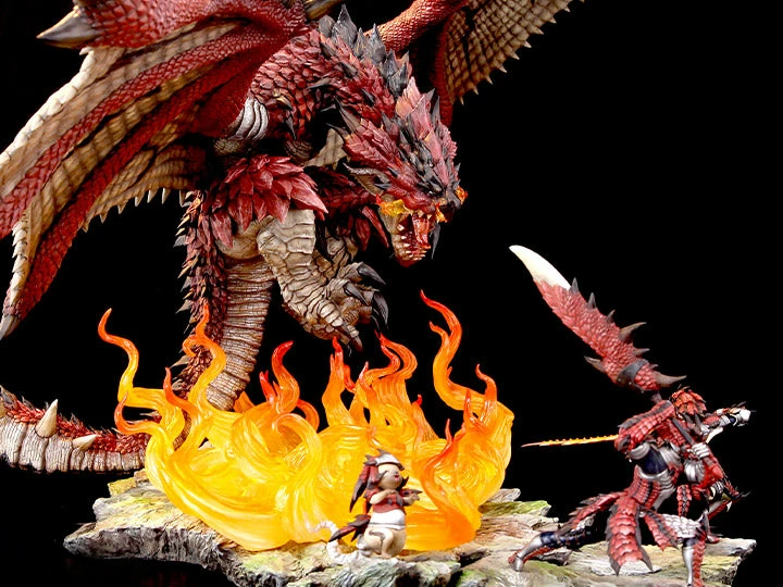 This diorama depicts the flagship monster Rathalos from the Monster Hunter game in battle against the Hunters and their Palico.ย Each of the hunters will come with their own individual base and all bases are separable, including the Palico. The diorama features light up LED features with clear translucent resin for the fire effects. This monsterous diorama stand at over 20 inches tall!