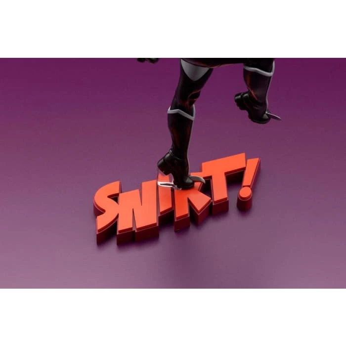 The sound when Wolverine extends her adamantium claws, “SNIKT!” is sculpted as part of the base and adds a cheeky tweak to the statue as a whole.