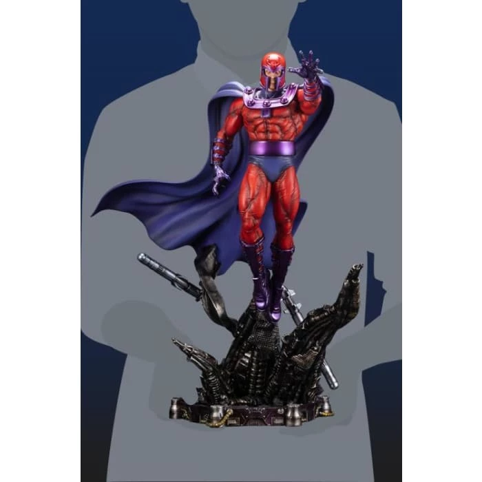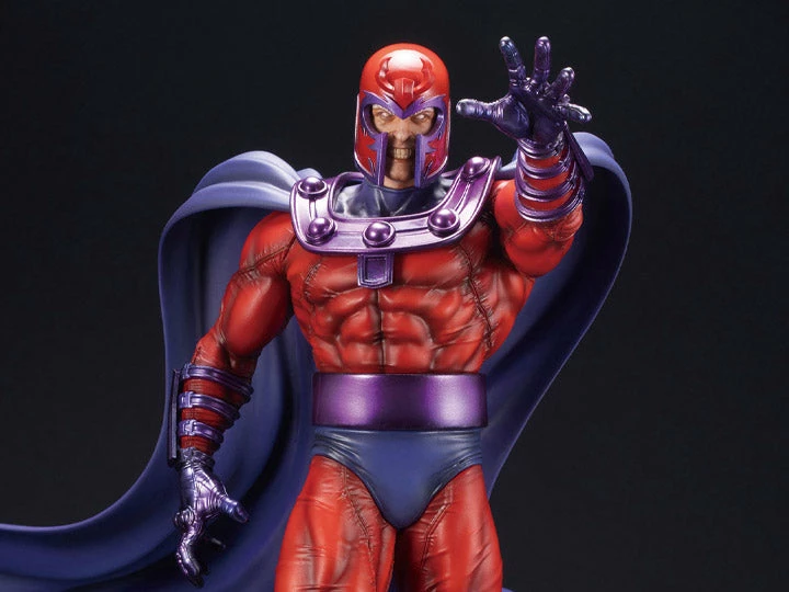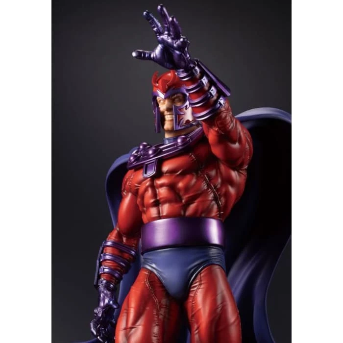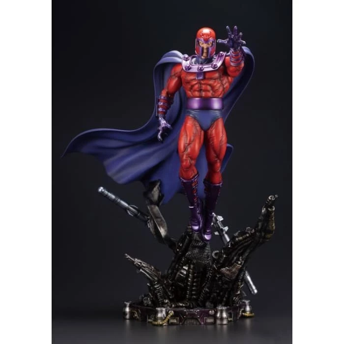 The latest addition to the revamped Fine Art Statue line is the X-Men villain and master of magnetic fields, Magneto. Standing over 40cm tall, this impressive piece is Kotobukiya’s second rendition of Magneto in statue form. Magneto’s muscular form, honed by using his magnetic powers to float inspace, makes him look younger than Professor X despite being close inage. The villan is overflowing with rage at mankind for mistreating his fellow mutants, and resignation towards his former friend for refusing to compromise his ideals to change the world. Befitting of the strongest mutant, the statue’s pose captures Magneto’s might as he can bend anything at his will using his magnetic powers.