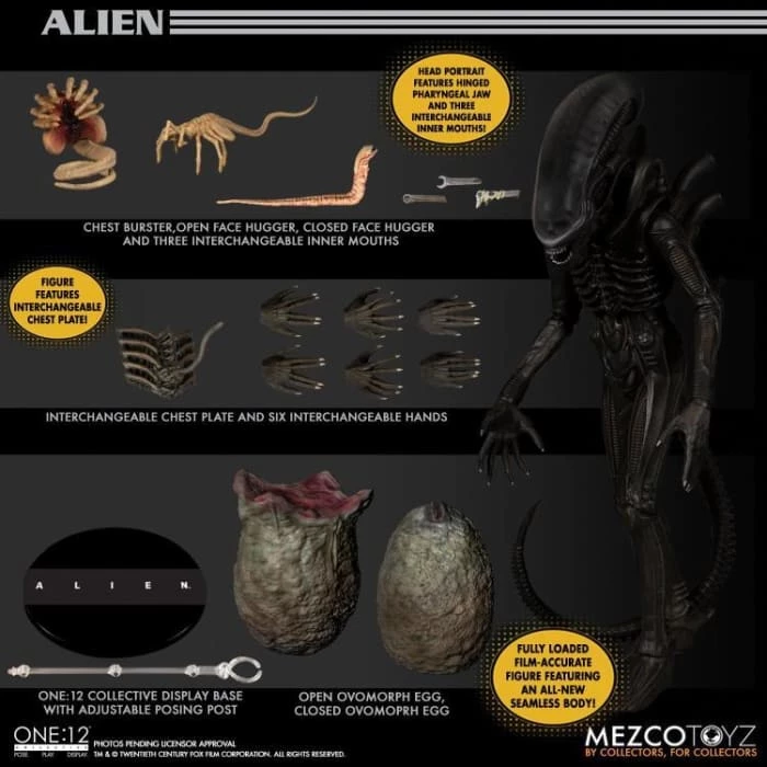 Alien is fully loaded with film-accurate accessories including a coiled Facehugger that can fit over the heads of most other One:12 Collective figures, an open Facehugger, a Chestburster, and an open and closed Ovomorph egg.ย