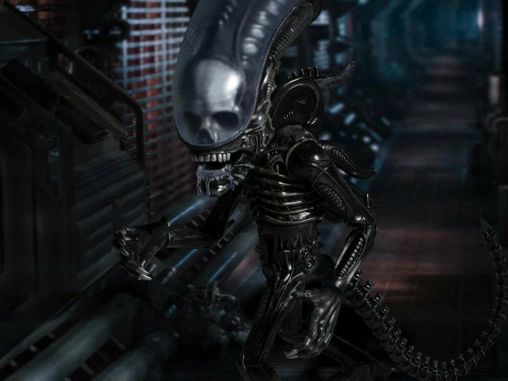 The hostile Xenomorph features a hinged outer jaw with a pop-out pharyngeal jaw inside and removable drool FX, interchangeable hands and legs, and a posable tail.