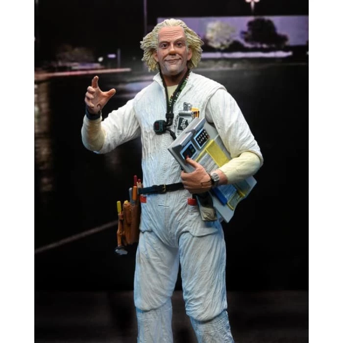 Featuring the official licensed likeness of actor Christopher Lloyd, this Ultimate Doc Brown 7″ scale action figure is based on his hazmat suit appearance in 1985.