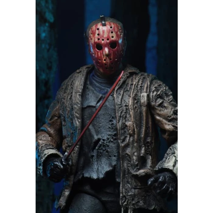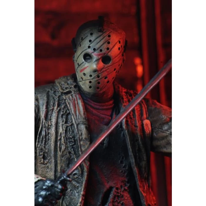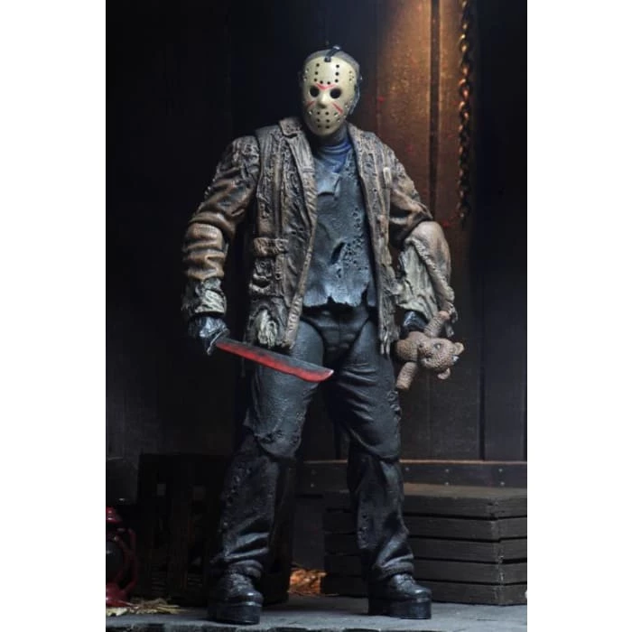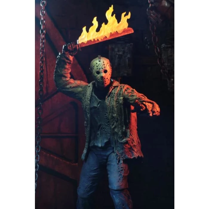 This new Jason figure is even more sizable than other Ultimate Jasons, as appropriate for a horror showdown on the movie’s scale. He comes with 3 removable masks, 2 machetes (regular and bloody), teddy bear, and fire effect that can attach to either machete to recreate the final blistering battle. Collector-friendly window box packaging with opening flap.