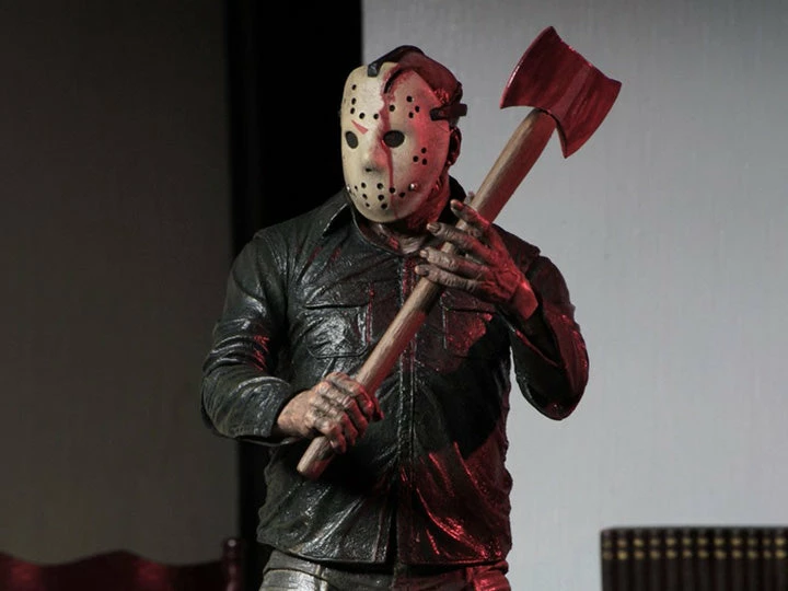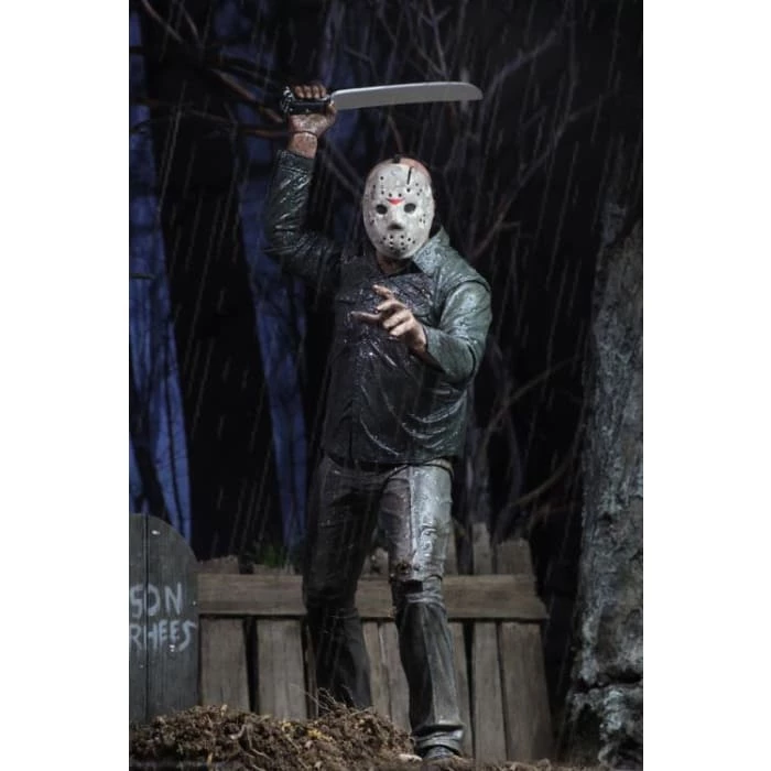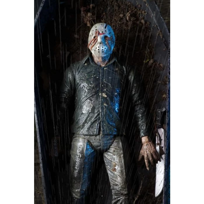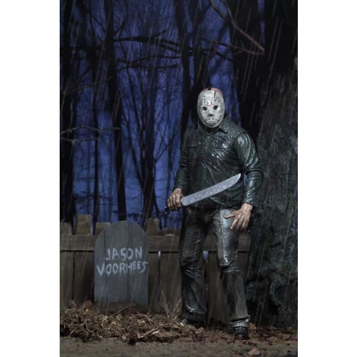 It’s also packed with accessories–machete, axe, ice pick, and tombstone. Bonus: includes an extra left hand with split fingers that can be used with this figure or the Ultimate Part 4 Jason! Comes in a display-friendly deluxe window box with opening flap.