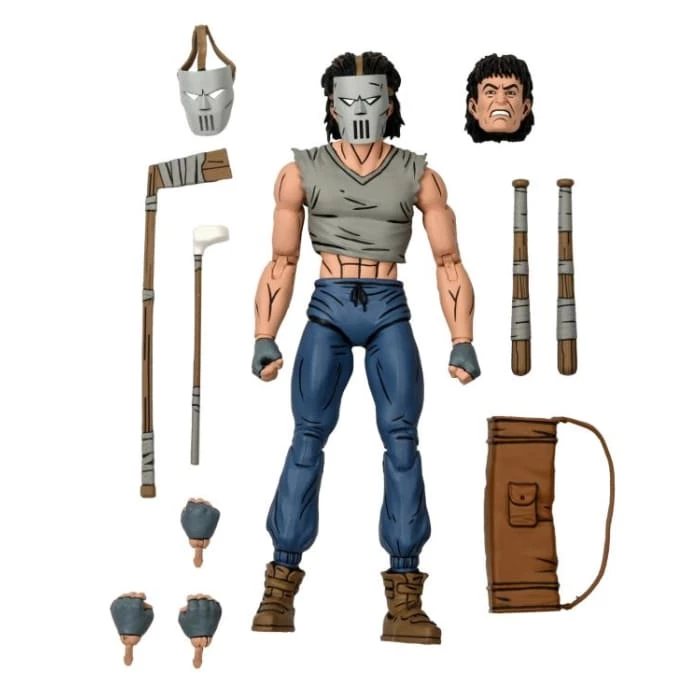 Casey stands approximately 7โณ tall, and includes interchangeable heads and hands, plus hockey mask, golf bag, bats, hockey stick, and golf club! Comes in all new special comic-book themed window box packaging illustrated by Kevin Eastman.