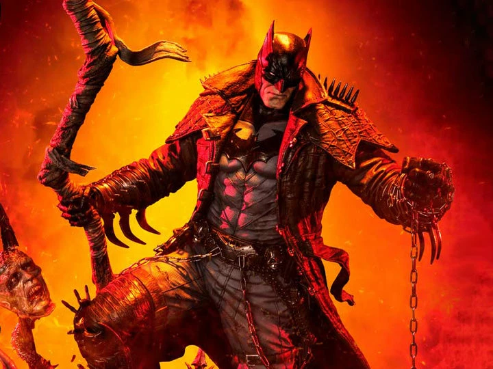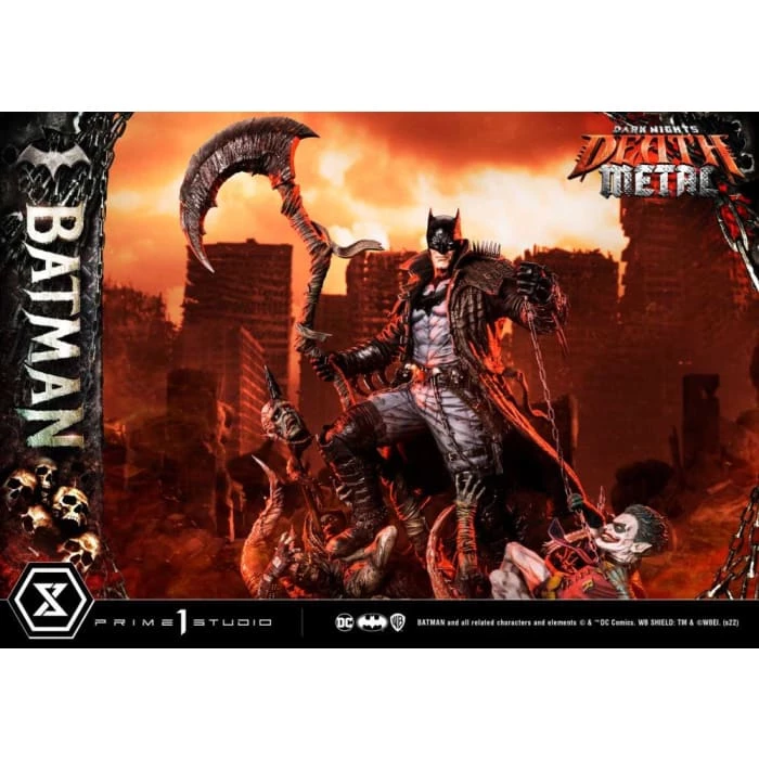 Prime 1 Studio has crafted a Batman at his most dangerous! At a commanding 41 inches tall, he has shed every pretense of subtlety! Batman has covered himself in a grungy, bat-like leather trench coat with over large shoulder spikes, solid metal bracers with razor-sharp fins, and an industrial strength utility belt chained to the toughest-looking, butt-kicking boots! In the books, his trench coat grants Batman the power to cloak himself from detection. The Dark Knight has taken it upon himself to become a post-apocalyptic Grim Reaper by wielding a giant scythe as his signature weapon! Most of all, he has found himself the owner of a powerful Black Lantern ring, allowing him to command an inexhaustible supply of reanimated corpses: his Undead Army!