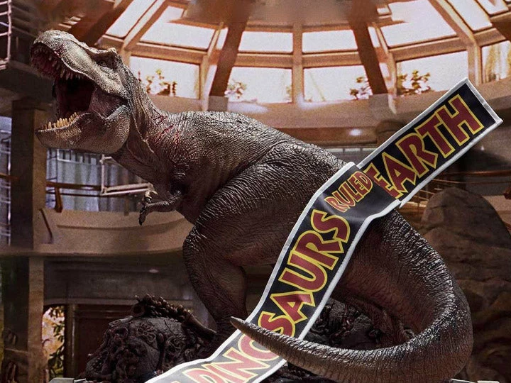 She stands at a proud 14.5 inches in the middle of Jurassic Park’s Visitor Center Rotunda, roaring to proclaim her victory! We had equipped this iconic statue with its own fabric “When Dinosaurs Ruled the Earth” banner, so you can drape it over her in commemoration of the epic movie scene or set it aside so she can bask in her glory.