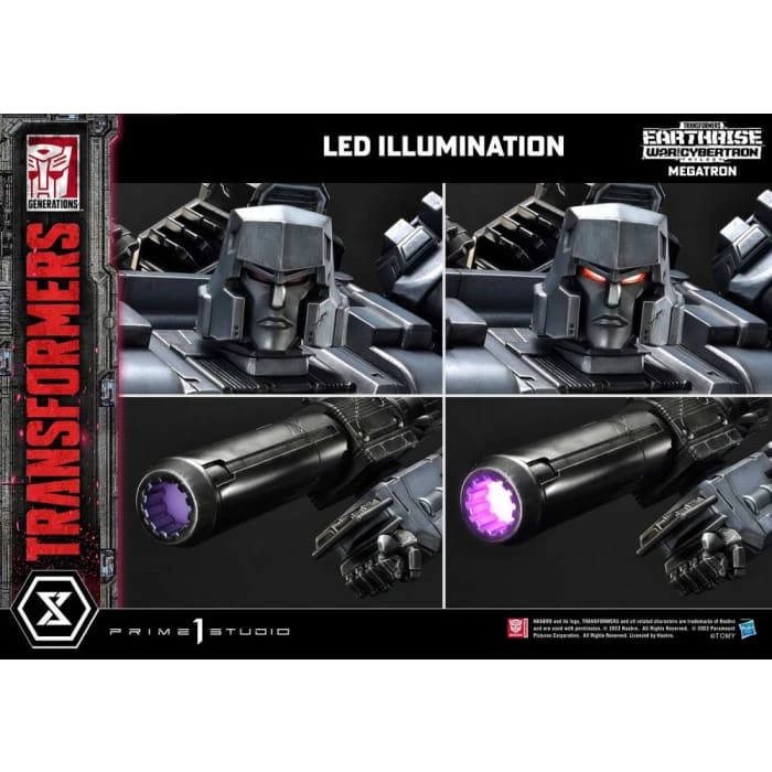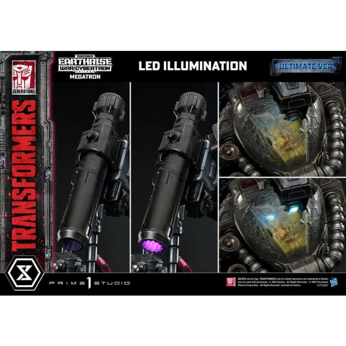 Never back down from a fight, Megatron comes with fully illuminated LED eyes and devastatingly powerful Fusion Cannon! This incredibly recreated statue comes with two (2) swappable right arms and three (3) swappable left arms, which offer more flexible storytelling and display opportunities.
