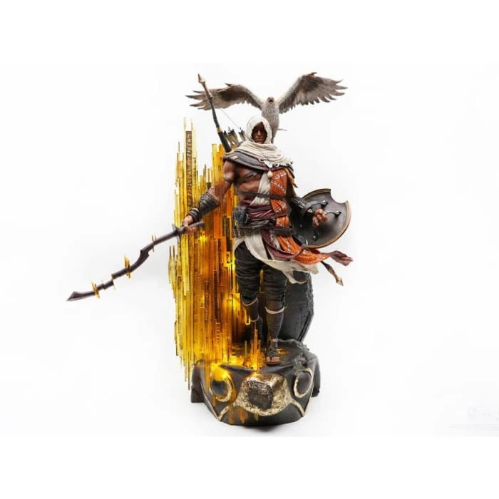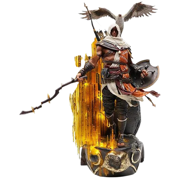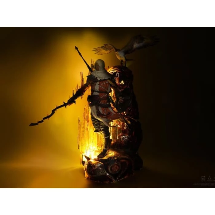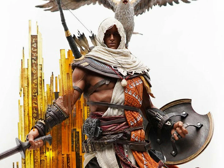 From the Assassinβs Creed video game series, capture the moment Bayek materializes from the Animus synchronization with this 1:4 scale polyresin statue by Pure Arts. Standing 27 inches tall, the co-founder of the Hidden Ones is sculpted with his loyal eagle companion, Senu, and features LED lights.
