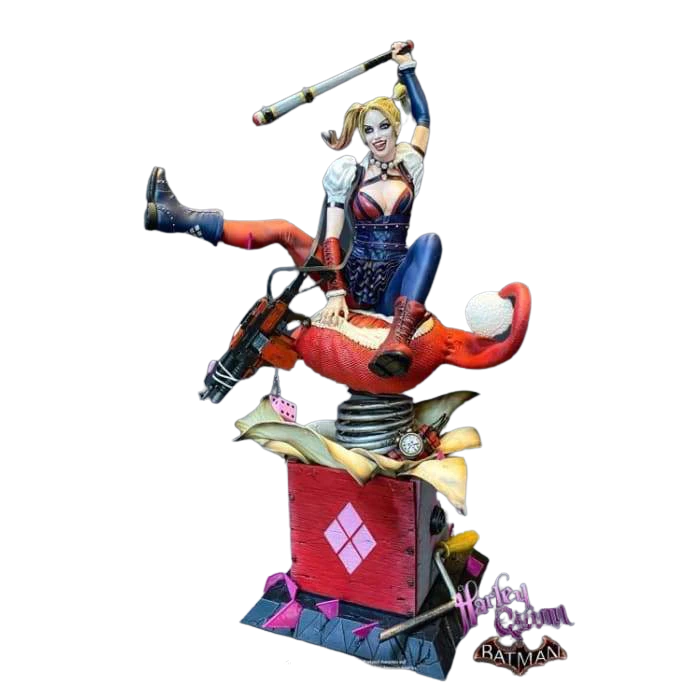 Harley Quinn was sculpted with immense detail to emulate her character, plus the exclusive, jack-in-the-box themed base creates a scene of villainous mayhem! She comes with 2 interchangeable heads, 2 interchangeable hands, a mini print, and an authenticity card.