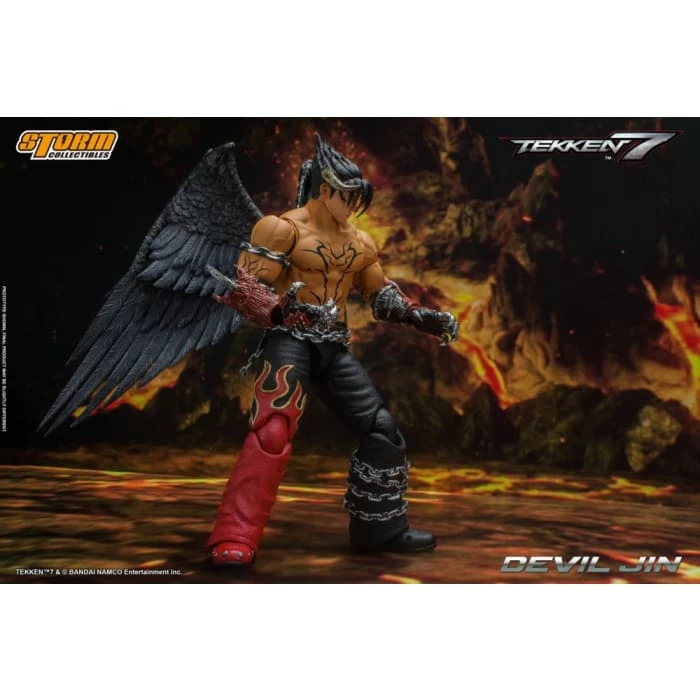 Devil Jinย is a demon with only ultimate power and destruction on his mind.ย The result of Jinโs mind and body being taken over by the devil Gene.ย After he defeated Azazel, Jin Kazama was apprehended by UN troops. As his unconscious body was being transported by helicopter, he became possessed by his devil form, ripped free from his straitjacket, tore through the helicopterโs fuselage with a powerful beam attack, and then escaped.