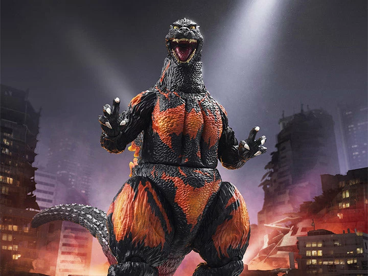 Even the mighty Godzilla has its limits, and exposure to the high-purity uranium deposits on Birth Island and the resulting fission reaction has Godzilla looking more than just hot under the collar! Measuring 8” tall, 4.5” wide, and a monstrous 14” long to the tip of its tail, this highly articulated Toho ULTIMATES! figure of “Burning” Godzilla is inspired by the 1995 film Godzilla vs. Destoroyah. Including interchangeable heads & hands and smoke effect accessories, this is one hot looking Godzilla figure! Be sure to get this made-to-order ULTIMATES! Godzilla 1995 figure before the chance to add it to your collection is extinguished for good!
