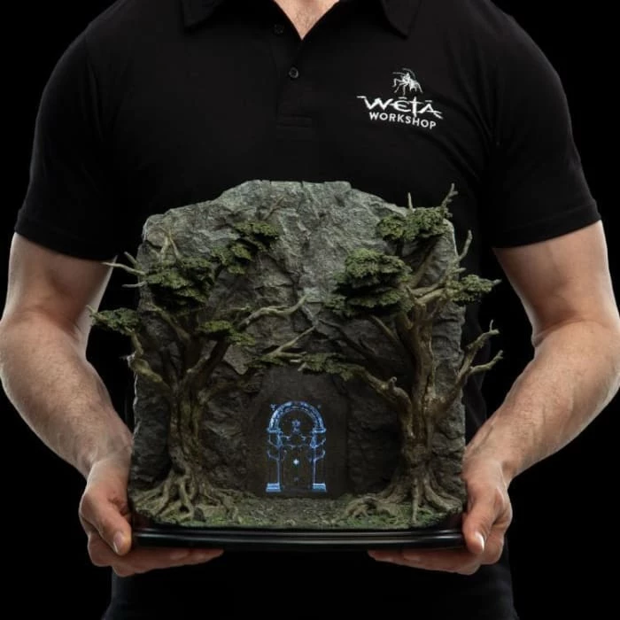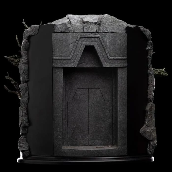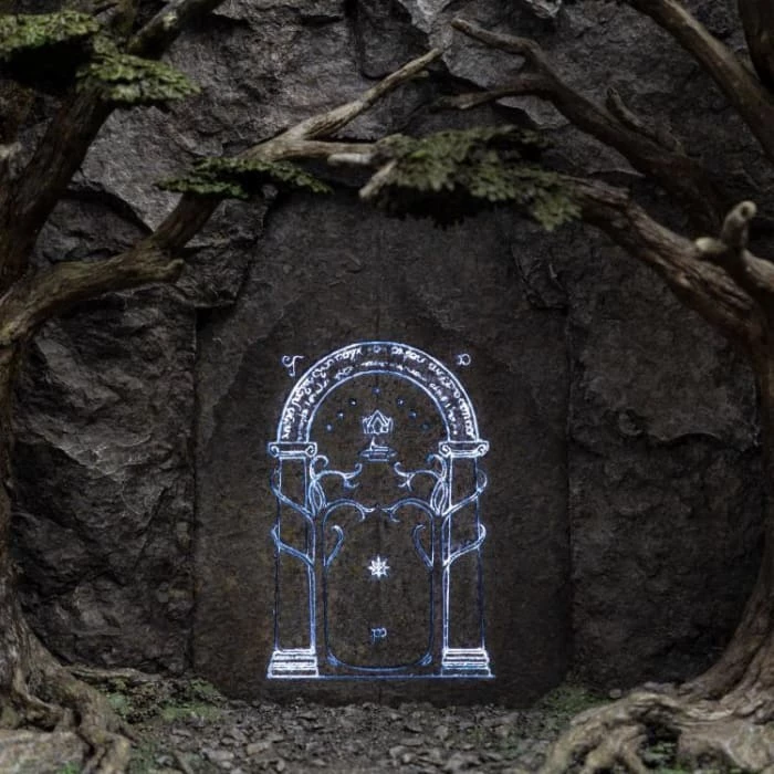 In times of wealth and peace the western entrance to Khazad-dΓ»m stood open. Commerce thrived between Durinβs people and the neighbouring Elves. The doors themselves were a symbol of friendship between the two, wrought as they were by both Dwarven and Elven hands. Mithril mined within was spun with magic into ithildin letters and iconography that shone only in the light of the moon or stars. Upon their sheer surfaces were inlaid the initials of their makers, the king, and the riddling inscription βSpeak friend and enterβ. Β